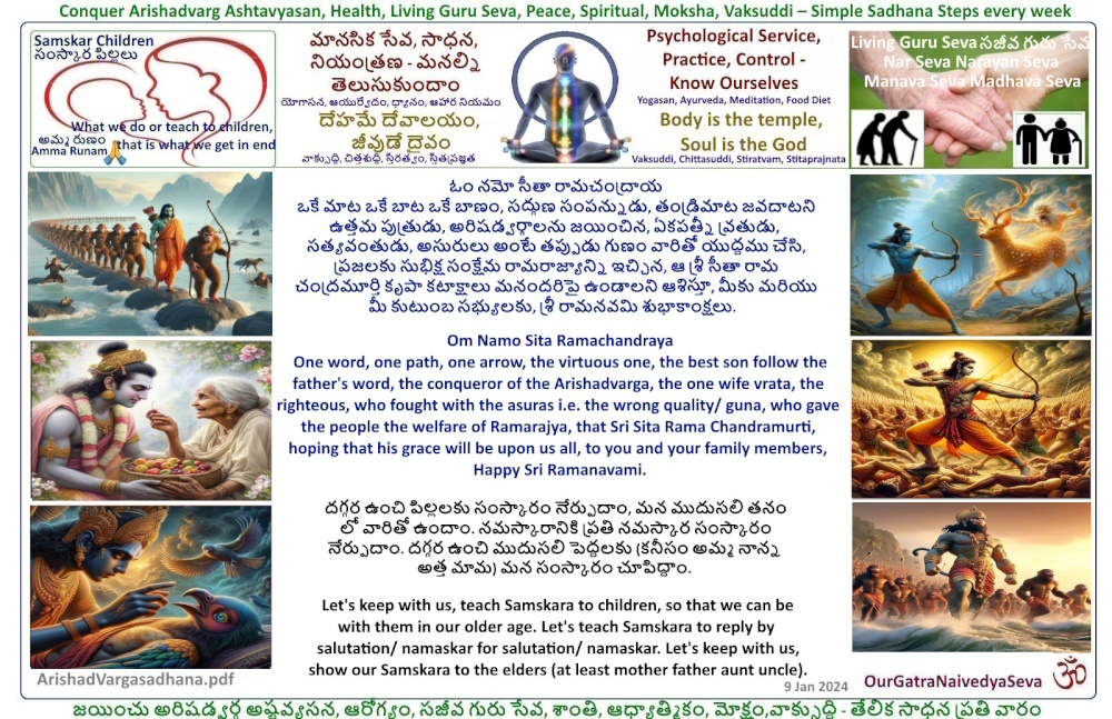 కనీసం రాముని, సీతమ్మ, హనుమాన్, లవ, కుశ, విభీషణ, సుగ్రీవ, వాల్మీకి, కౌసల్య, శబరి గుణాలు, ఇంట్లో మనకు భాగస్వామికు పిల్లలుకు ఒకరికైనా, చేతలలో ఉన్నాయి అని ధైర్యంగా పదిమందికి చెప్పగలమా?